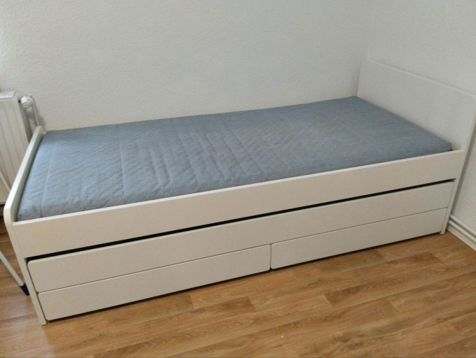 Doppelbett, klappbares, weißes Bett, mit zwei Matratzen und Schubladen.