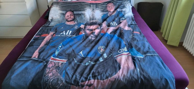 Verkauft wird einen Bettwäsche Set von Messi, Mbappé und Neymar in den PSG Trikots