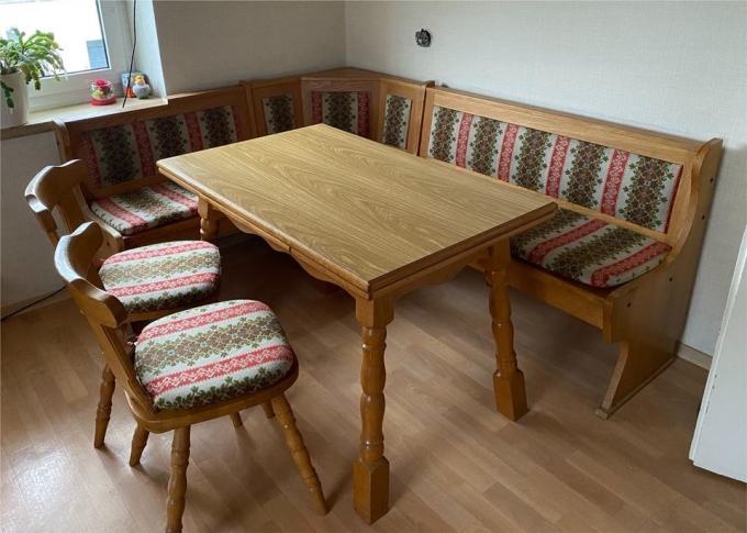 Verschenkt wird eine gebrauchte Eckbank mit Tisch und zwei Stühlen.