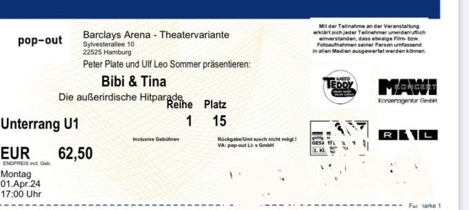 Leider muss ich meine beiden Tickets für Bibi und Tina „die außerirdische Hitparade“ am 01.04.2024 um 17:00 Uhr verkaufen. Es handelt sich um Plätze