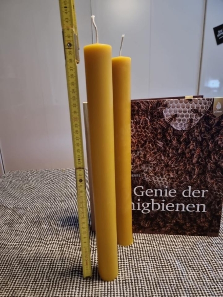 Diese große Bienenwachskerze wiegt 410 g, ist ca. 39 cm hoch und 4 cm dick.