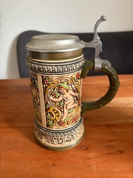 Bierkrug Zinndeckel bayrische Sammlung Antiquitäten Engel Jäger