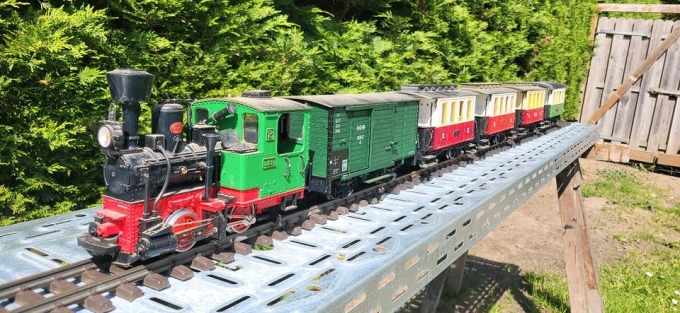 Biete aus Nachlaß eine analoge Stainz mit Soundwagen und Personenzug an. Die Personenwagen sind beleuchtet und werden mit Batterien betrieben. Alle Personenwagen haben Metallachsen und Fahrgäste im Inneren. Der Soundwagen wird, mittels Bananenstecker mit der Lok verbunden. Dann ist das Geräusch einer stehenden Dampflok zu hören ( dafür werden zwei 9 Volt Blockbatterien benötigt ). Wenn die Fahrspannung erhöt wird erhöhen sich auch die Dampfstöße.