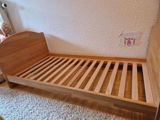 Biete ein Bett, dass sowohl als Babybett als auch als Kinderbett benutzt werden kann. Es besteht aus Massivholz und befindet sich in einem sehr guten Zustand. Es lässt sich auf zwei unterschiedliche Höhen aufbauen und zwei Gitterseitenteile sind mit dabei (nicht auf den Fotos zu sehen). Bei Bedarf kann eine passende Matratze kostenlos mitgenommen werden.