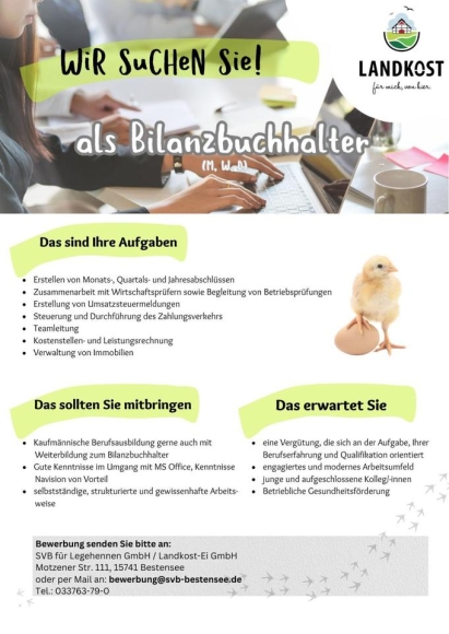 Hinter der Marke Landkost stehen zwei miteinander verbundene Unternehmen: Der Spreenhagener Vermehrungsbetrieb für Legehennen GmbH, nachfolgend SVB genannt, kümmert sich um die artgerechte Aufzucht und Haltung der Legehennen. Für den Vertrieb und die Logistik der Eier ist die Landkost-Ei GmbH zuständig. Mit unserer erfolgreichen Mischung aus verlässlicher Markenqualität, Nachhaltigkeit und Verbraucherschutz haben wir es nicht nur bis in die Spitzenplätze der größten deutschen Eiervermarkter geschafft, sondern auch auf die Frühstückstische vieler tausender Kunden im gesamten Bundesgebiet. Und das jeden Tag.