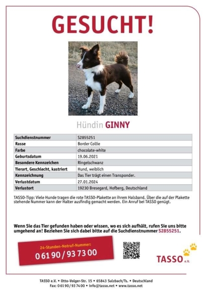 Meine Hündin ist am 27.01.24 gegen Mittag in 19230 Bresegard entlaufen.