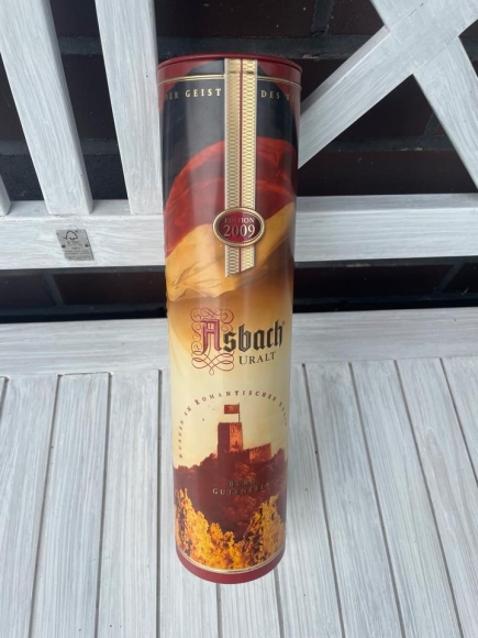 Hier gibt es eine leere Dose von der Marke Asbach Uralt