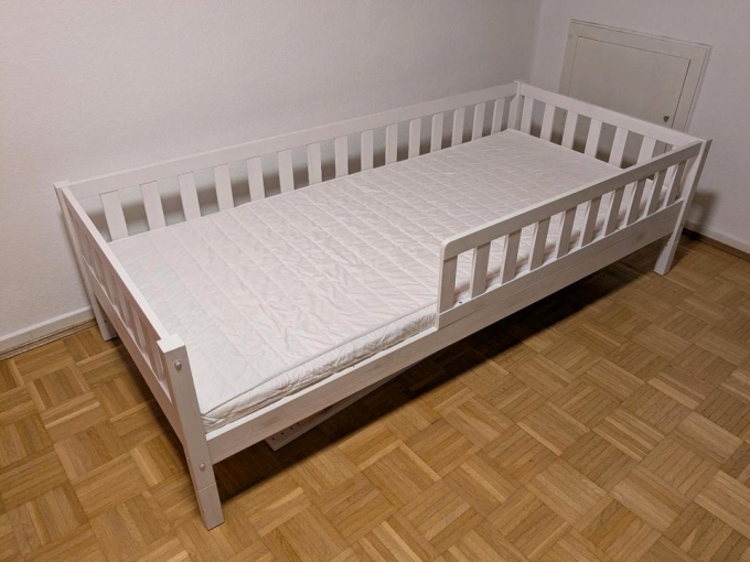 Wir haben das Bett für 200 € ebenfalls über Kleinanzeigen gekauft. Das Kind der Vorbesitzer hatte es wohl kaum benutzt, weil es nicht darin schlafen wollte. Wir haben uns letztlich ebenfalls für ein anderes Bettkonzept entschieden, ohne dass unsere Tochter je in dem Bett geschlafen hätte. Daher dürfte das Bett fast unbenutzt sein. Dennoch ist als mein - normalgewichtiger - Partner sich darauf setzte eine Latte gebrochen (siehe Bild), sodass nur noch ein komplett intakter Lattenrost dabei ist. Ich empfehle allerdings den Kauf eines Standardlattenrosts mit Rahmen, damit derlei Unfälle nicht passieren und habe aufgrund der schlechten Qualität der "Roste" einen wesentlich geringeren Preis gewählt. Das Bett steht abgebaut zur Abholung bereit.