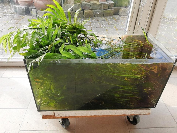 Grosse Menge grosser Exemplare abzugeben. Zum Vergleich habe ich sie in einem 60 cm Aquarium fotografiert- da passen sie gar nicht hinein. Auf dem letzten Foto sieht man, daß die Art in einem offenen Becken auch über den Wasserspiegel hinauswächst.