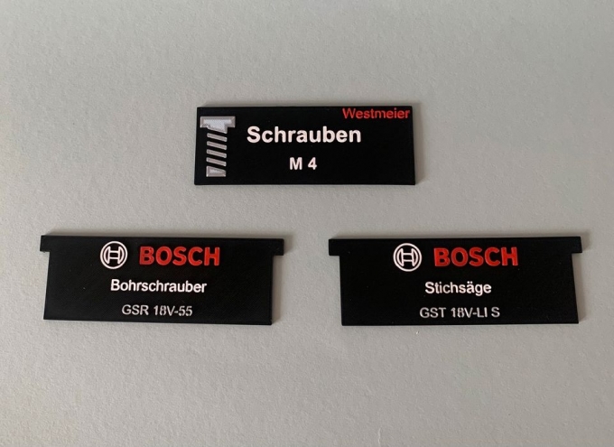 Ich verkaufe hier personalisierte und individuelle Beschriftungsschilder für die Sortimo L-Boxxen. Die Schilder werden mit einem 3D Drucker mit Multimaterial Einheit gedruckt.