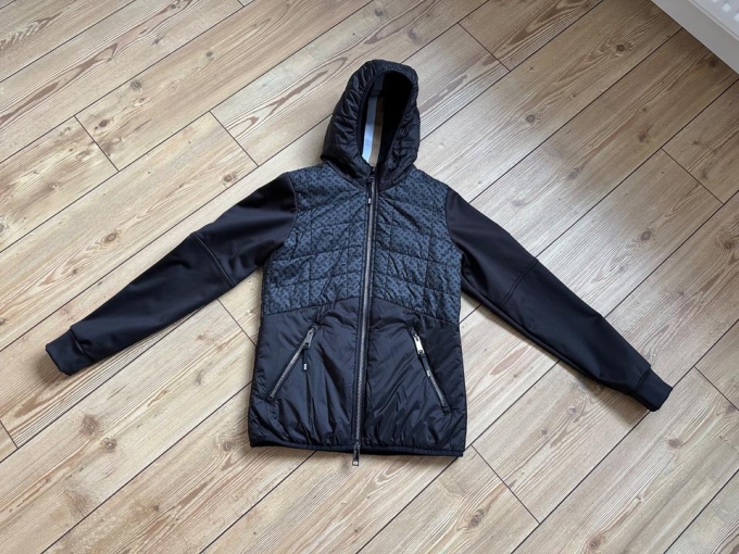 Ideal für den Übergang. Wattierte Jacke mit Softshell-Ärmeln. Atmungsaktiv, wasser- und winddicht. Schlanke Passform. Fleece-Futter in den Vordertaschen.