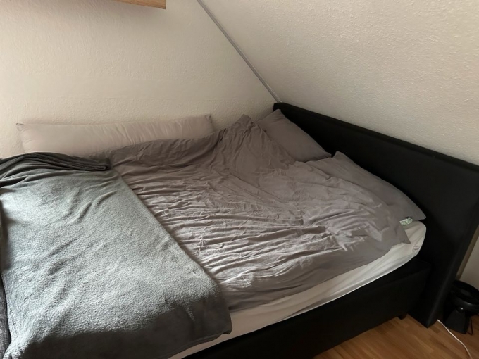 Boxspringbett mit schwarzem Lederimitat bezogen. Zwei einzelne Bettgestelle mit einer durchgängigen Matratze. Das Bett ist ca. 2 Jahre alt, gut erhalten, leichte Gebrauchsspuren, durch Reibung haben sich kleine Flusen auf der Matratze gebildet.