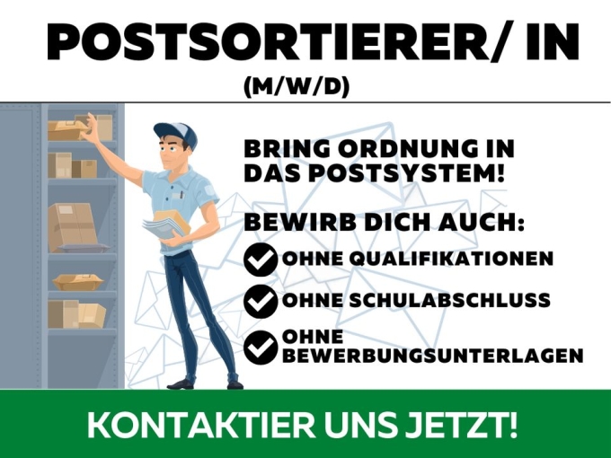 DU bist auf der SUCHE nach einem TEIL- oder VOLLZEIT JOB als QUEREINSTEIGER mit BESONDERS GUTEM Gehalt ? Hast dich bereits bei vielen Firmen beworben, allerdings keine Antworten oder nur Absagen erhalten ?! Dann bist du bei UNS genau RICHTIG ! Im Auftrag eines Paketzentrums sind wir mit dieser Stellenanzeige auf der Suche nach BRIEFSORTIERERN (M/W/D) in 13351 Berlin –Wedding.