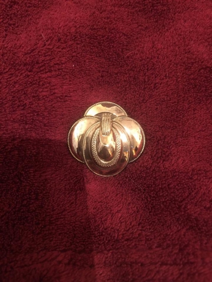 Brosche, wahrscheinlich Jugendstil. Sie hat eine kleine Öse, um an einer Kette getragen zu werden, sowie eine Anstecknadel. Das winzige Loch auf der Rückseite könnte ein Hinweis auf Schaumgold sein … ist jedoch nur eine Vermutung.