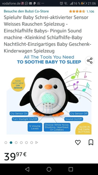 Bubzi Pinguin Spieluhr Baby Schrei-aktivierter Sensor Nachtlicht