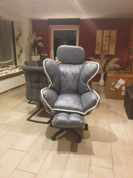 Der Stuhl hat eine Fußstütze und hat Wippfunktion.