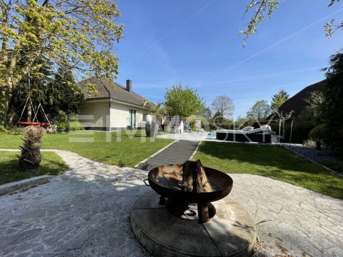 Ein großer eingelassener Pool mit Wärmepumpe, Granitterrasse, Steg zum Pool, Poolhaus, Feuerstelle und üppiger Bepflanzung mit winterharten Palmen erweitern den Wohnraum nach außen und laden zum entspannten Verweilen unter freiem Himmel ein. Hier kommt Urlaubsstimmung auf!