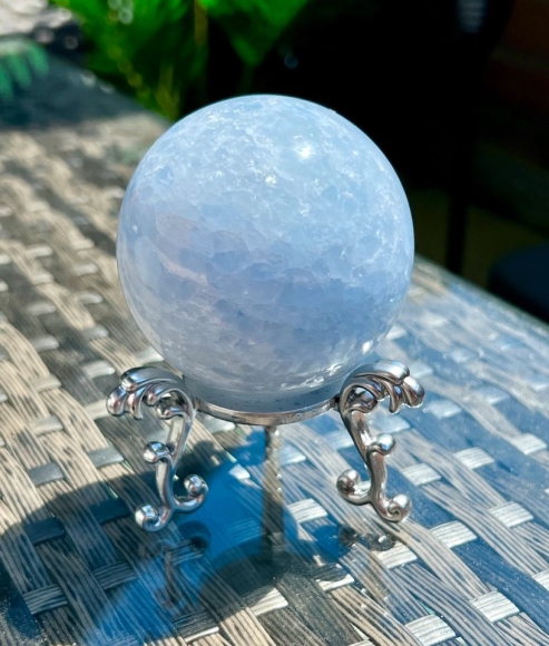 Ich verändere meine Sammlung und gebe diese schöne hellblaue Calcit Kugel ab. Die Kugel sieht aus wie eine Eislandschaft aus Eiskristallen.