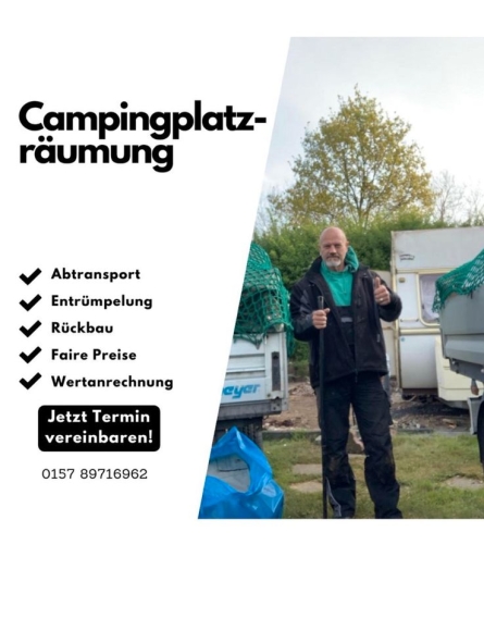 ich bin Andreas und spezialisiere mich auf professionelle Campingplatzauflösungen mit umfassendem Service. Wenn Sie Ihren Campingplatz auflösen möchten und dabei Unterstützung benötigen, bin ich Ihr zuverlässiger Partner. Mein Service umfasst nicht nur die Auflösung des Platzes, sondern auch den Abtransport Ihres Campingwagens und die vollständige Räumung des Areals.