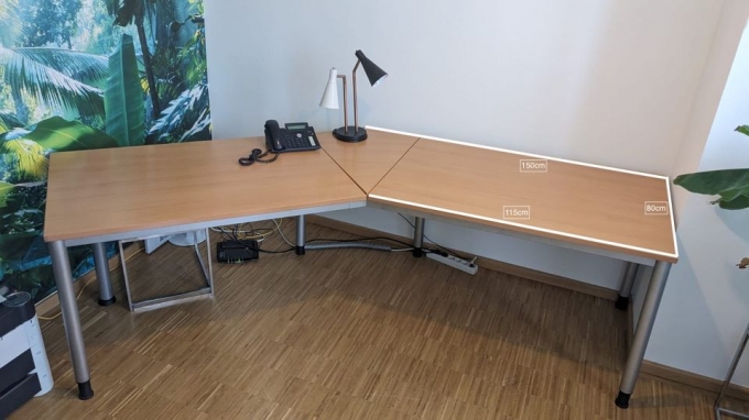 Die beiden Tischplatten sind jeweils 1.60m lang, sodass der Tisch durch den Winkel etwa 2.80m beansprucht.