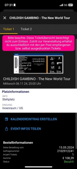 Ich verkaufe ein Stehplatzticket für Childish Gambino, am 6.11.2024, in Hamburg. Ich habe das Ticket als Papierticket, weshalb ein kleiner Betrag Versand dazu käme, allerdings nicht viel. Bei Interesse gerne melden:)