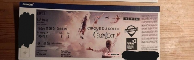 Zum Verkauf steht oben abgebildete Karte für die Veranstaltung 'Cirque du Soleil Corteo' am Freitag, den 11.10.24 in der SAP Arena Mannheim. Die Karte wurde über Eventim gekauft. Rechnung ist vorhanden. Preis ist verhandelbar. Bei Versand kommen je nach Auswahl der Versandart noch die Versandkosten zzgl. hinzu. Bei Fragen gerne melden.