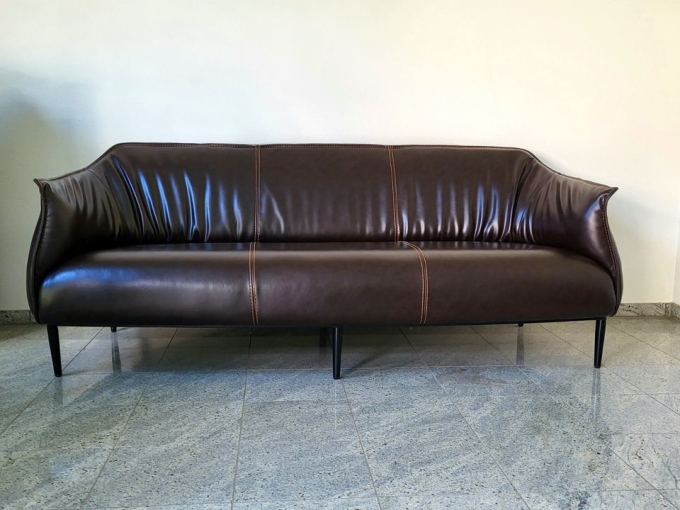 Neuwertiges, braunes, fest gepolstertes 3-sitzer Sofa mit Kunstlederbezug und hell abgesetzten Nähten. Makellose Verarbeitung mit schicker Rückseite - auch als Raumteiler geeignet.