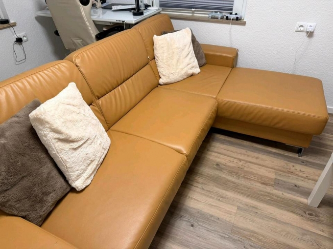 Bitte eine L Couch in Cappuccino an. Lederimitat.