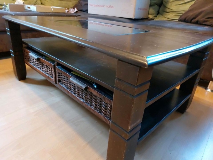 Gebrauchter Couchtisch aus Holz mit zwei Schubladen als Körbe(eins ist etwas beschädigt)