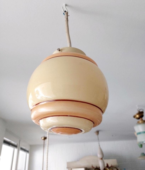 Hübsche dänische Deckenlampe im art déco Stil der 30er/40er Jahre. Lampenschirm aus Opalglas, Höhe 19cm, Durchmesser 15cm.