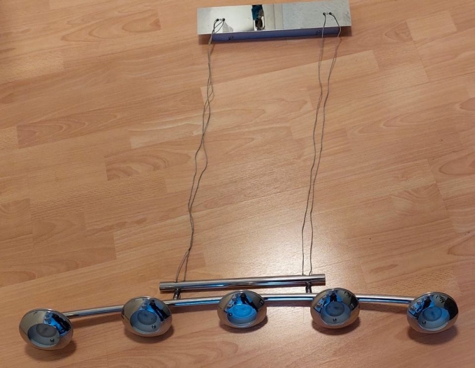 …ist im Auftrag eine Deckenleuchte - Esstischlampe - mit 5 LED Leuchten in Silber.