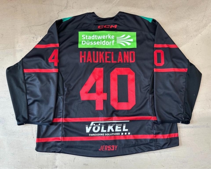 Zum Verkauf steht ein Game Worn DEG Trikot von Henrik Haukeland aus der Saison 2024-25