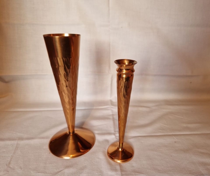 Ich biete aus dem Nachlass meines Opas diese Kupfer-Vasen, beide in gutem Zustand, da sie immer im Wohnzimmer-Regal standen.