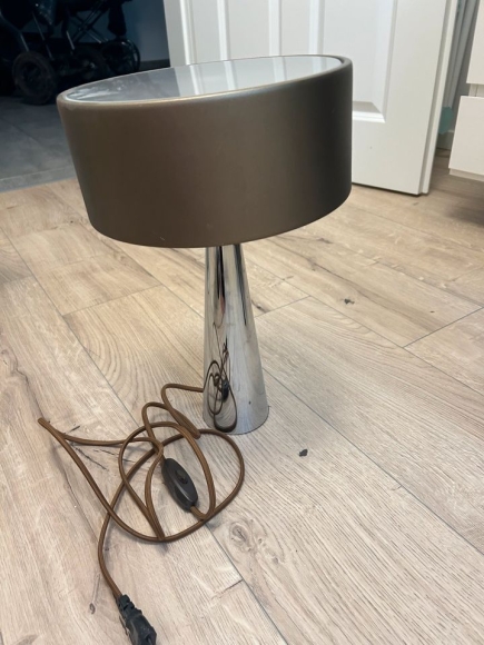 Design Tischlampe mit Glasdeckel und Metallsockel.