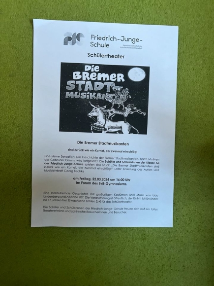Eine kleine Sensation : Die Geschichte der Bremer Stadt Musikanten , Nach Motiven der Gebrüder Grimm, wird Fortgesetzt. Die Schüler und Schülerinnen der Klasse 5a der Friedrich Junge Schule spielen das Stück „Die Bremer Stadt Musikanten sind Zurück wie ein Komet der der 2 einschlägt