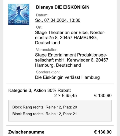 2x Disney Musical Die Eiskönigin für Sonntag den 07.04. abzugeben wegen Terminkollodierung.
