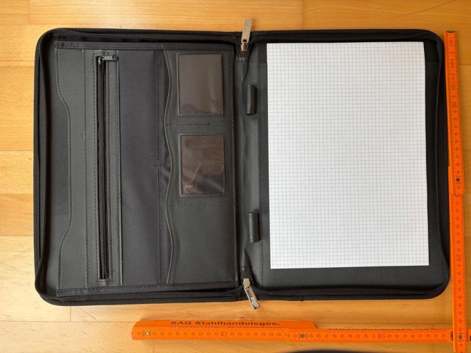 Material schwarzes Gewebe mit Reisverschluss. Innenteil enthält karierten Schreibblock