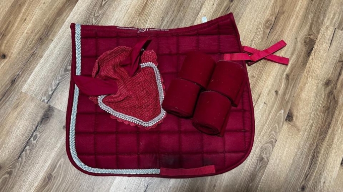 Zum Verkauf steht ein wunderschönes dunkelrotes Dressurset DL (anatomisch geformt) mit Schabracke, Fliegenohren und Bandagen von der Marke USG. Mit dem Glitzer ein absoluter Hingucker.