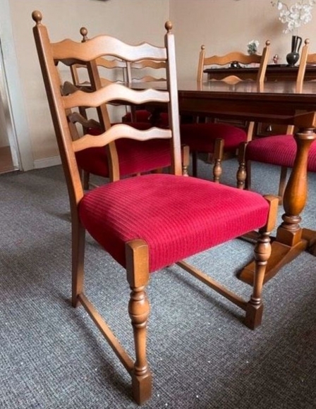 Ich verkaufe hier 8 sehr gut erhaltene Esszimmer-Stühle aus echtem Holz. Die Stühle sind sehr gut verarbeitet und haben eine sehr schicke rote Federkernpolstererung.