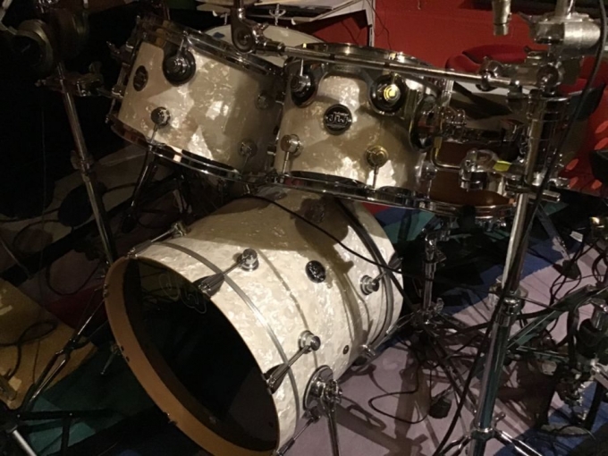 Sehr schönes, gepflegtes Set in White Marine Pearl. Bass 20" ungebohrt, Toms 10", 12", Standtom 14", Snare 14x5,5". Inkl. 2Ständer mit DW Halterungen für die Toms und für je ein Becken. Felle fast neu.