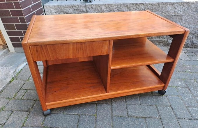 60er Jahre Teak Beistelltisch Phonowagen auf Rollen mit Schublade 80x48x44cm Sehr guter Zustand.