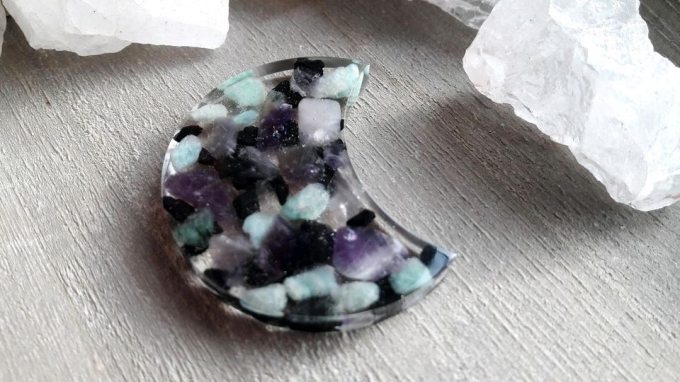 Hier habe ich aus Resin Harz und verschiedenen Edelsteinen einen Halbmond gemacht. In ihm sind Amethyst, Amazonit, Bergkristall und Schungit Edelsteinchen.