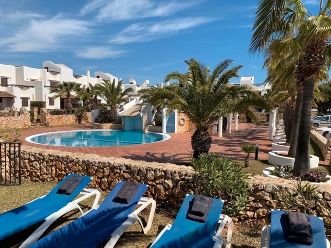 Vom Wohnbereich und vom Schlafzimmer aus hat man Zugang zu einer schönen Terrasse mit Ausblick auf einen der beiden Gemeinschaftspools die sich in der Anlage befinden.