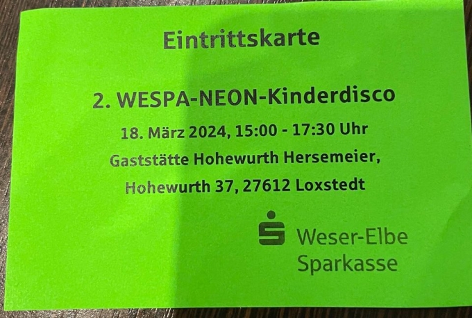 Karte für die Wespa Neon Kinderdisco am 18.03.2024 in Hohewurth abzugeben.