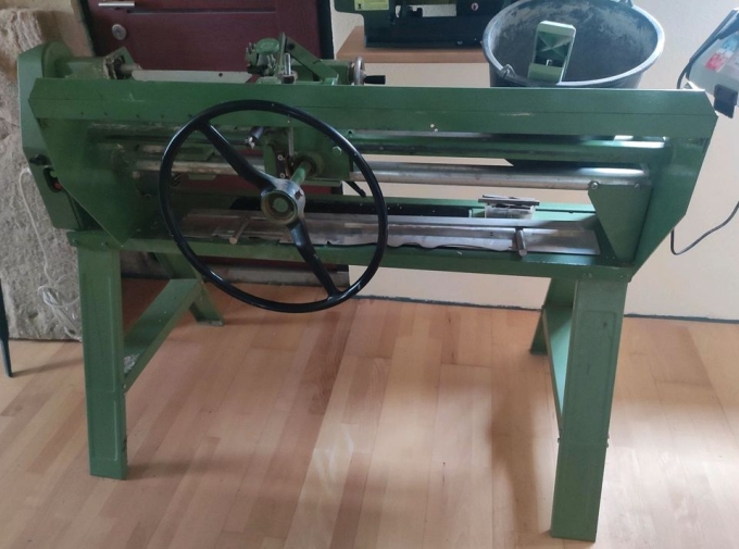 Elektra Beckum Holzdrehbank mit Kopiereinheit Marke Eigenbau. Es können 2D Schablonen aus Blech, Sperrholz oder HDF geschnitten und eingespannt (festgeschraubt) werden.