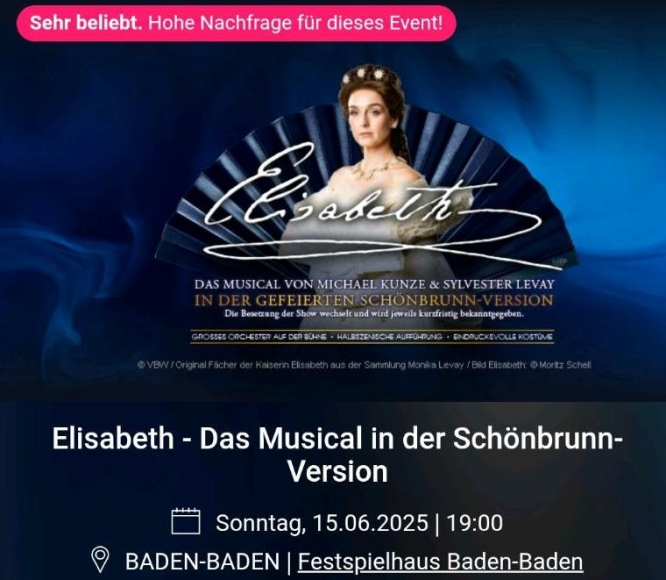 Ich verkaufe eine Karte für das Elisabeth Musical am Sonntagabend (15.06.25) um 19Uhr im Festspielhaus Baden-Baden.