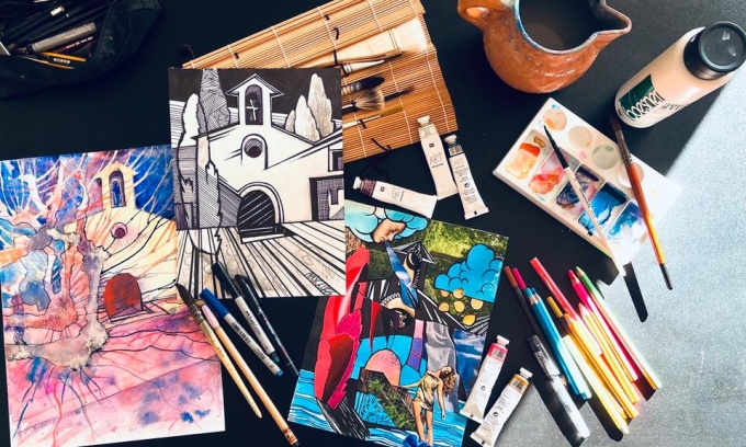 Anhand von einer Fotographie kreieren wir eine Serie von Bildern in diversen Maltechniken: Aquarell, Gouache, Tusche, Fineliner, Kohle, Collage, Schablone.
