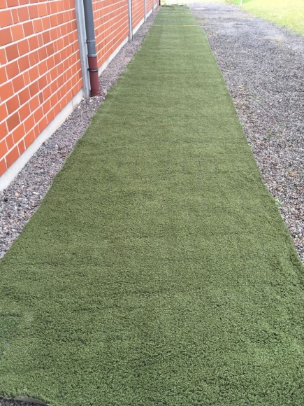 Kunstrasen mit der Floorhöhe von ca. 3 cm. Die Rollen sind ca. 36 m lang und ca. 1,90 m breit, insgesamt ca. 68 qm. Das Gewicht einer Rolle ist ca. 250 kg.