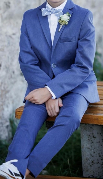 Entzückender Kinderanzug für die Erstkommunion! Dieser wie neue Anzug in strahlendem Blau ist perfekt für den großen Tag Ihres Kindes. Das Set beinhaltet ein elegantes weißes Hemd mit blauen Applikationen am Ärmel und am Hals, eine Hose in Größe 134 und ein Sakko in Größe 140 für den perfekten Sitz. Zusätzlich sind Hosenträger und eine Fliege im Set enthalten. Stilvoll, klassisch und bereit, Ihren kleinen Gentleman strahlen zu lassen!