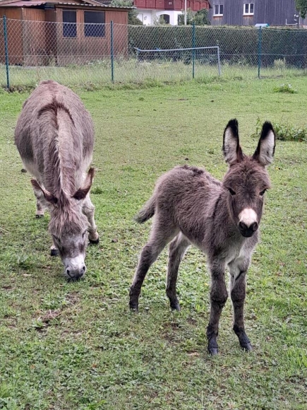 Verkaufen Minieselstute mit Stutfohlen oder nur Stutfohlen! Elterntiere beide am Hof. Stuten 84cm und Hengst 75cm!